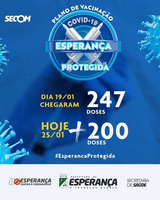 Hoje (25/01) chegam mais 200 doses do imunizante ao nosso município. Essa remessa faz parte da primeira fase de imunização que abrange os profissionais de saúde. 👏🩺 📌É importante que todos continuem com os protocolos se protegendo e protegendo os que você ama até que cheguem vacinas suficientes para todos. Prefeitura Municipal de Esperança-O trabalho avança!