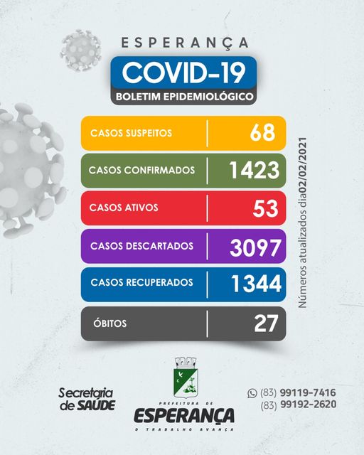 Até o momento, temos 1423 casos confirmados,53 casos ativos, 3097 casos descartados,68 casos suspeitos,1344 recuperados e 27 óbitos. Pedimos a todos que evite sair de casa, caso seja possível. Também recomendamos a não se envolver em aglomerações de pessoas. . Lembrando que os sintomas são, febre, tosse seca, dores no corpo e mal-estar, fadiga e falta de ar. Em caso de dúvidas, ligue (83) 9 9119-7416 ou (83) 9 9192-2620, estamos à disposição para te ajudar. O Município segue todos os protocolos do Ministério da Saúde (MS) para divulgação do Boletim Epidemiológico do Município. . O Boletim do Estadual pode apresentar divergências, tendo em vista o local de cadastro do cartão do SUS do usuário e/ou a realização de testes em outros municípios. Reforçamos que todos os casos estão sendo monitorados. Problema de quase todos os municípios Paraibano . A prefeitura Municipal de Esperança reforça a importância dos esperancenses procurar sua Unidade Básica de Saúde assim que os PRIMEIROS sintomas surgirem. Ao sair de casa, usar máscara.